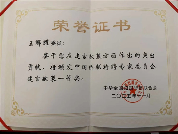 王辉耀荣获中国侨联特聘专家建言献策一等奖