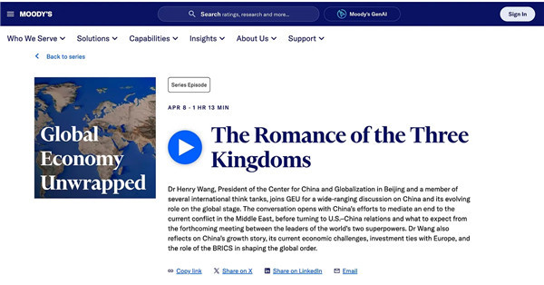 Moody’s Talks Interviews Wang Huiyao on China’s Global Role
